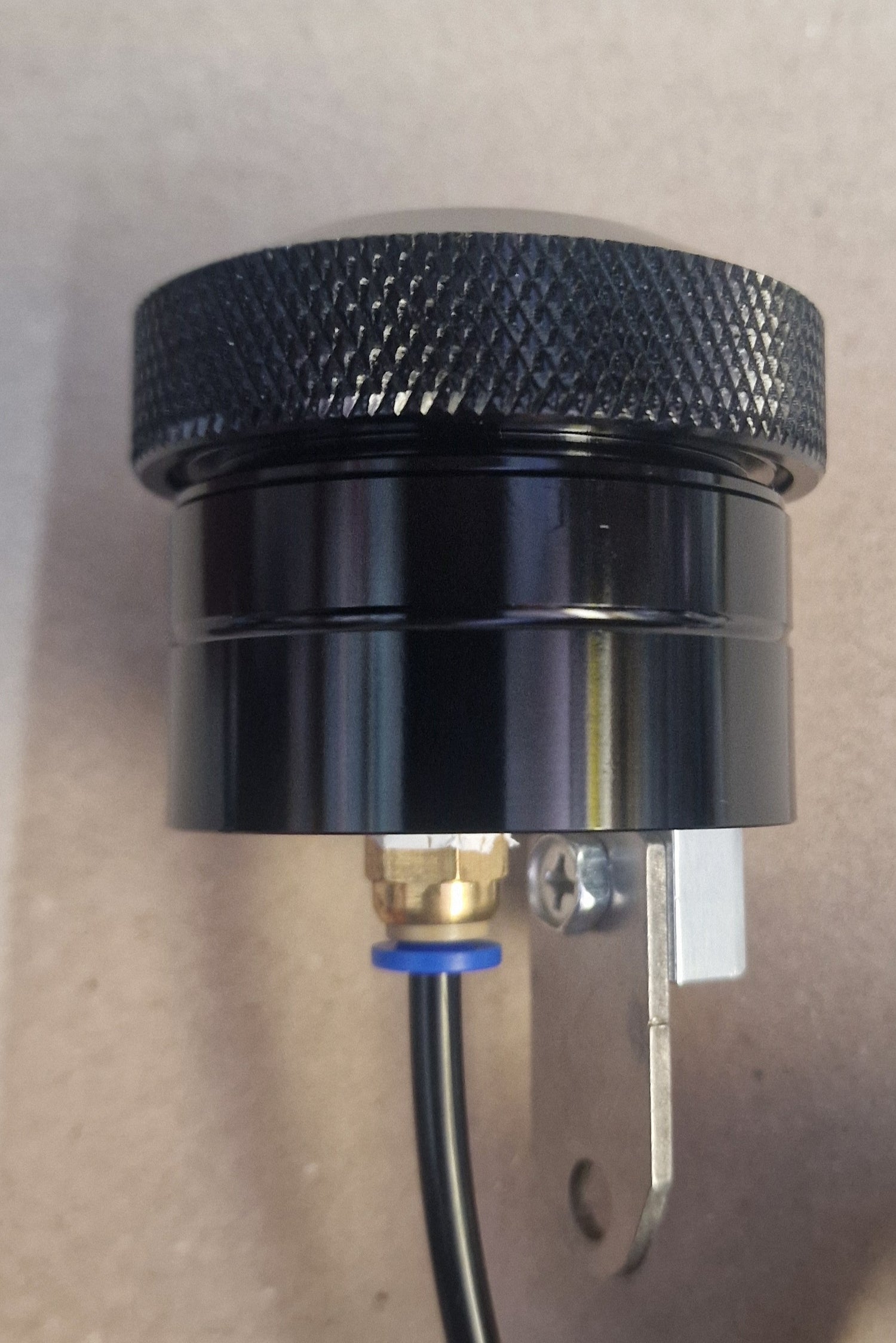 - Bei festerer Drehung nach rechts bei der sich das Gehäuse mitdreht wird bereits ein Überdruck aufgebaut, es kommt Öl aus der Leitung: Zwecks Entlüftung bei Erstmontage kann man so vorgehen, bei Wiederauffüllen den Behälter nicht mitdrehen.